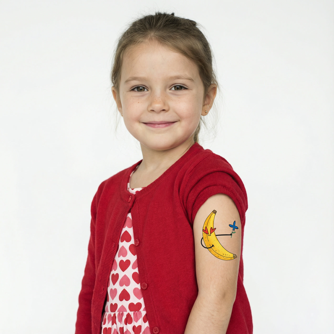 This smitten banana can’t hide its peel-good vibes! Sporting bright red heart eyes and offering a sweet blue blossom, the smiling fruit turns any arm or ankle into an instant burst of sunny, tropical charm.